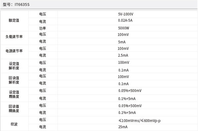 IT6635S(1000V/5A/5000W)為可編程大功率直流電源,是太陽(yáng)能電池陣列仿真電源,可以模擬太陽(yáng)能電池不同光照強(qiáng)度下的輸出I-V曲線,專門(mén)設(shè)計(jì)用于光伏逆變器的測(cè)試。該系列可支持4臺(tái)機(jī)器主從并聯(lián)連接,使操作簡(jiǎn)單方便。用戶可以根據(jù)自己的測(cè)試需求,編輯電壓輸出波形。該系列內(nèi)置標(biāo)準(zhǔn)的RS232/USB/RS485通訊接口,方便組件智能化控制平臺(tái),廣泛應(yīng)用于逆變器、動(dòng)力電池、DC-DC轉(zhuǎn)換器、其他電子產(chǎn)品的測(cè)試中。