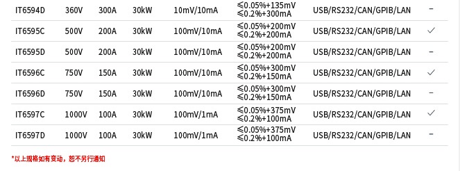 IT6500全系列超過100個機(jī)型。功率包含從800W到30KW,以及高達(dá)1000V/1200A的輸出范圍。支持主從并聯(lián),主動均流,并在功率擴(kuò)展后保持單機(jī)優(yōu)異的動態(tài)特性。不但有豐富測量功能、高速響應(yīng)的IT6500C系列,同時也提供高性能、穩(wěn)定輸出的IT6500D系列,用戶可以根據(jù)需求,輕松選擇。應(yīng)用領(lǐng)域包括汽車、綠色能源、高速測試、大功率測試等多個方面,是一款功能全面、性能優(yōu)異、適用廣泛的直流電源。尤其是IT6500C系列具有雙象限電流跨象限無縫切換功能,可以將功率吸收擴(kuò)展300%。同時內(nèi)置了多種標(biāo)準(zhǔn)汽車功率網(wǎng)用電壓曲線,以及支持太陽能板I-V曲線模擬功能。