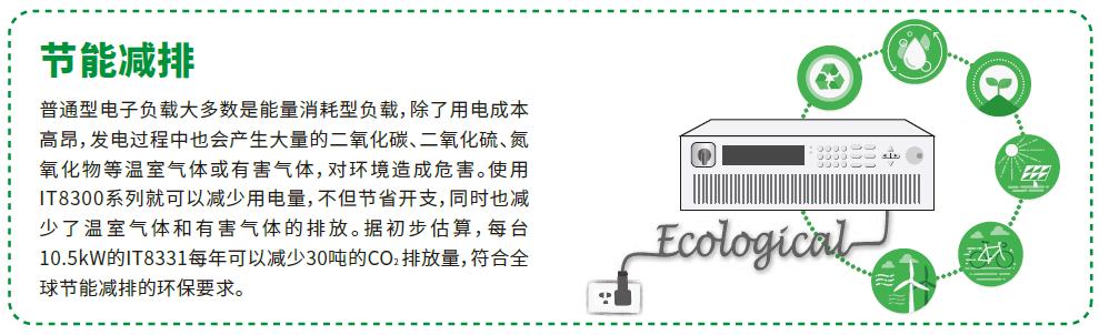 IT8300系列能量回饋式直流電子負(fù)載不同于能量消耗型的普通電子負(fù)載,其最主要的特點(diǎn)是提供獨(dú)特的能量回收功能,可以回收電能然后廠內(nèi)直接利用,而非以熱能的形式消耗掉。其轉(zhuǎn)換效率最高可達(dá)接近95%,不但大大降低了用戶的用電成本,同時也避免使用空調(diào)或昂貴的制冷系統(tǒng),減少噪音。