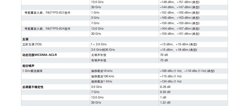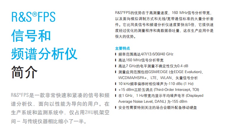 ?FPS 信號和 頻譜分析儀 簡介 ?FPS是一款非??焖俸途o湊的信號和頻 譜分析儀,面向以性能為導向的用戶。在 生產(chǎn)系統(tǒng)和監(jiān)測系統(tǒng)中,僅占用2HU機架空 間- 與傳統(tǒng)儀器相比縮小了一半。 ?FPS的優(yōu)勢在于高測量速度,160 MHz信號分析帶寬, 以及面向模擬調(diào)制方式和無線/寬帶通信標準的大量分析套 件。它比同類信號和頻譜分析儀速度要快出5倍,它提供速 度經(jīng)過優(yōu)化的測量程序和高數(shù)據(jù)吞吐量,這在生產(chǎn)應用中是 很大的優(yōu)勢。 主要特點 J 頻率范圍高達4/7/13.6/30/40 GHz J 高達160 MHz信號分析帶寬 J 高達7 GHz的電平測量不確定性僅為0.4 dB J 測量應用范圍包括GSM/EDGE (含EDGE Evolution)、 WCDMA/HSPA+、LTE、WLAN、矢量信號分析 J 10 kHz頻率偏移時相位噪聲為-110 dBc (1 Hz) J +15 dBm三階互調(diào)點 (Third-Order Intercept, TOI) J 在1 GHz、1 Hz帶寬內(nèi)顯示平均噪聲電平 (Displayed Average Noise Level, DANL) 為-155 dBm J 安全性需要特別關(guān)注的場合會額外配備移動硬盤。